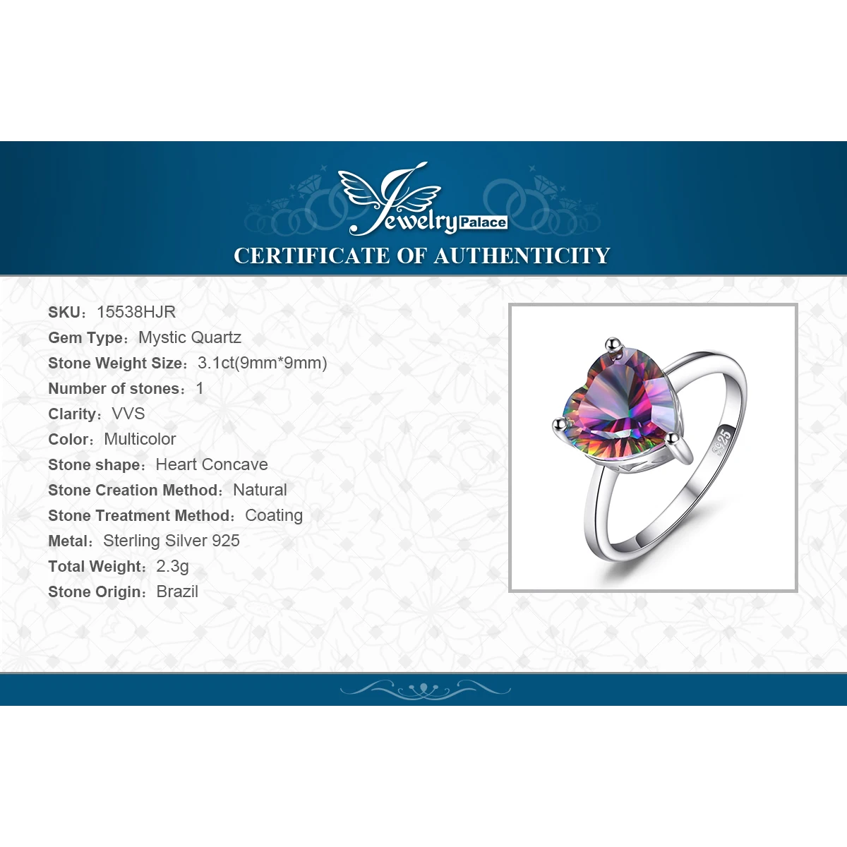 Embrace enchanting elegance with the JewelryPalace Heart Natural Rainbow Mystic Quartz Solitaire Ring. Crafted from high-quality 925 sterling silver, this exquisite ring features a mesmerizing heart-shaped rainbow mystic quartz gemstone. Radiating a spectrum of colors, from vivid purples to serene blues and greens, each stone is uniquely captivating.